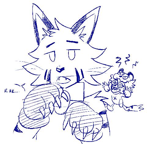 A doodle of two anthropomorphic animals. The maned wolf, with a silly expression on her face, asks “You want me to hold you like this??”, the otter she’s holding by the shoulder responds with “mhmm”]