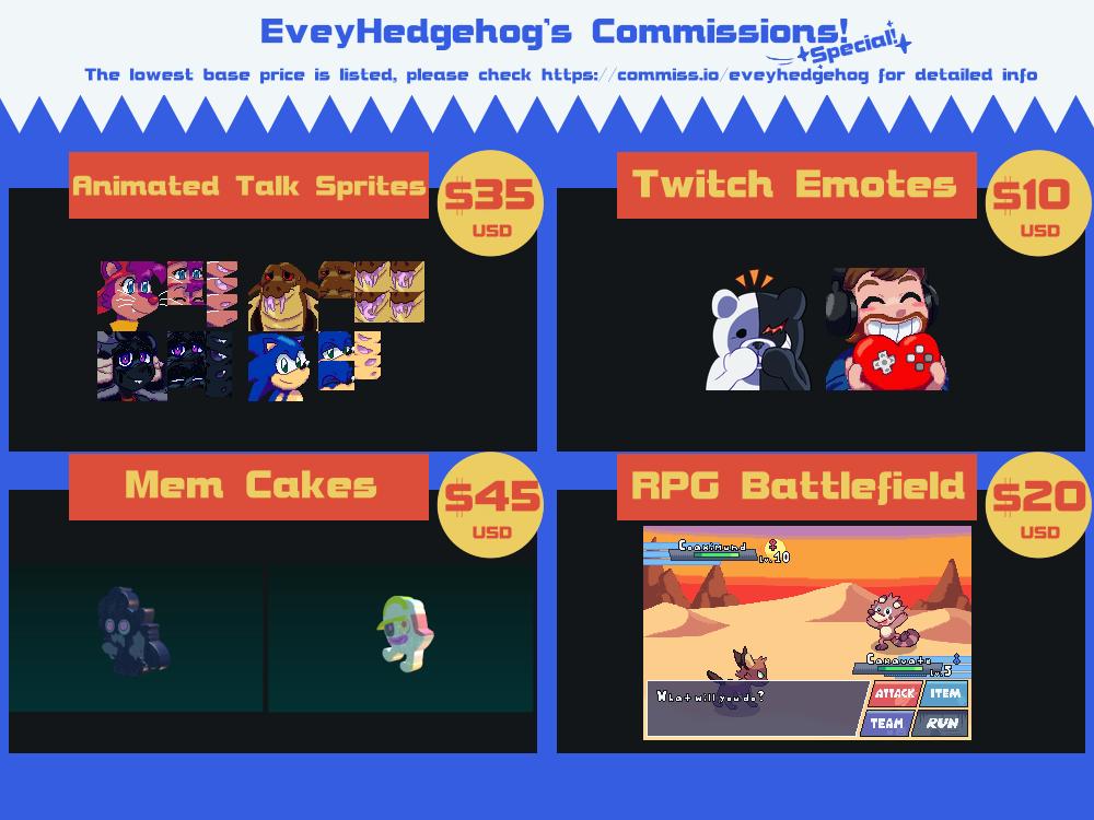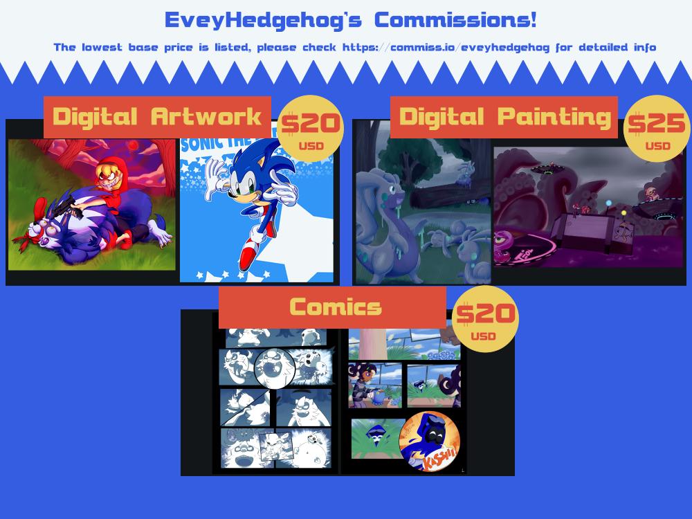 Here’s the very delayed, new commission sheet with updated prices and new choices. Go over to https://commiss.io/eveyhedgehog to see more detailed info about each there as well as sending a project if you’re interested, thank you!